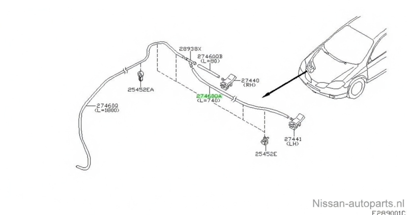 Ruitensproeierslang 740mm Nissan Primera P12 28940-AU301 Gebruikt.