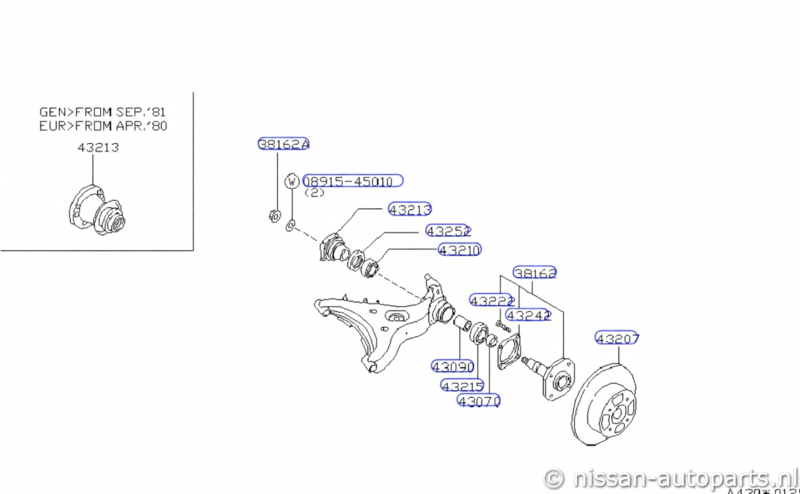 Artikelnummer: 55502P9100 43213S8000 38162W1200 43206P9601 OverzichtBetreft een gebruikte samenstelling van een draagarm + steekas + wiellager welke in deze samenstelling geschikt is voor een Nissan 280ZX S130 vanaf september 1981. Mogelijk meerdere uitvoeringen in omloop. Neem bij twijfel contact met ons op.