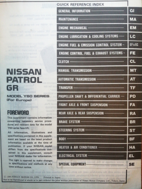 Artikelnummer: SM2EY60SE0 OverzichtBetreft een gebruikt service manual voor de Nissan Patrol Y60 voor de Europese markt.