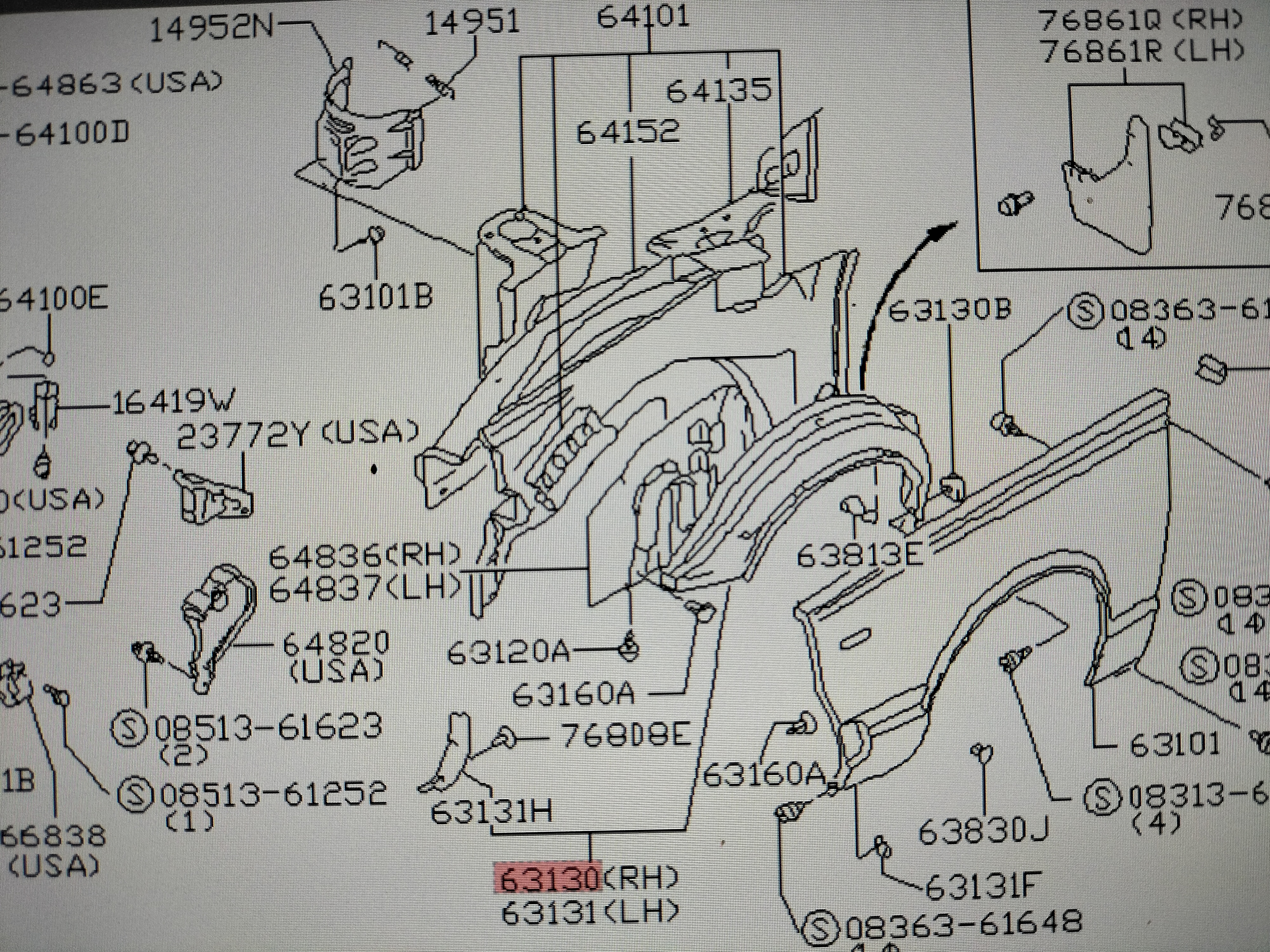 Onderdeel zit gemonteerd achter het rechter zijscherm. Betreft positienummer 63130 op de tekening.