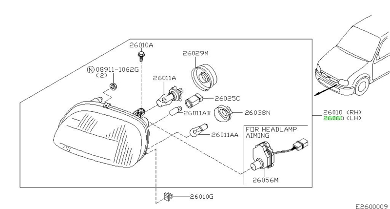 The part includes the headlight leveling motor (11) 26056-6F700.