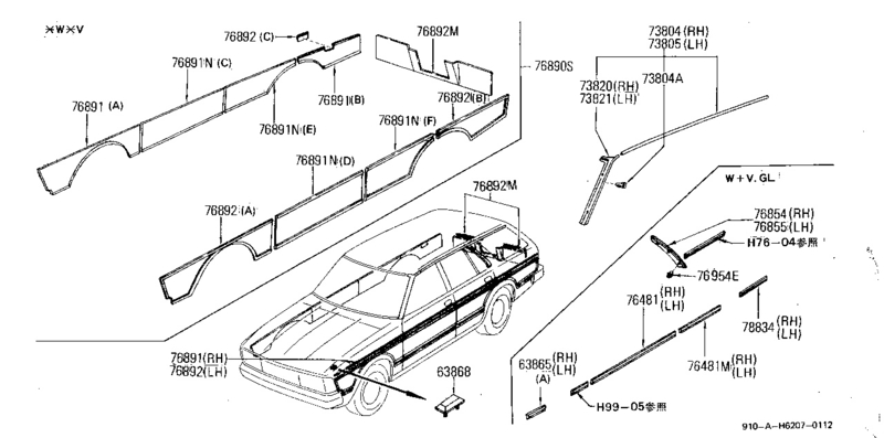 Moulding set-roof drip, right-hand Nissan Bluebird 910 Part of 76813-W2725 (76813-W1000) Incomplete Original.
